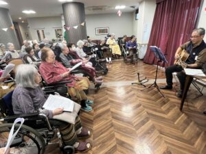 毎月開催している「ギター歌の会」を行いました。たっぷり1時間先生の歌声に合わせて歌いました。